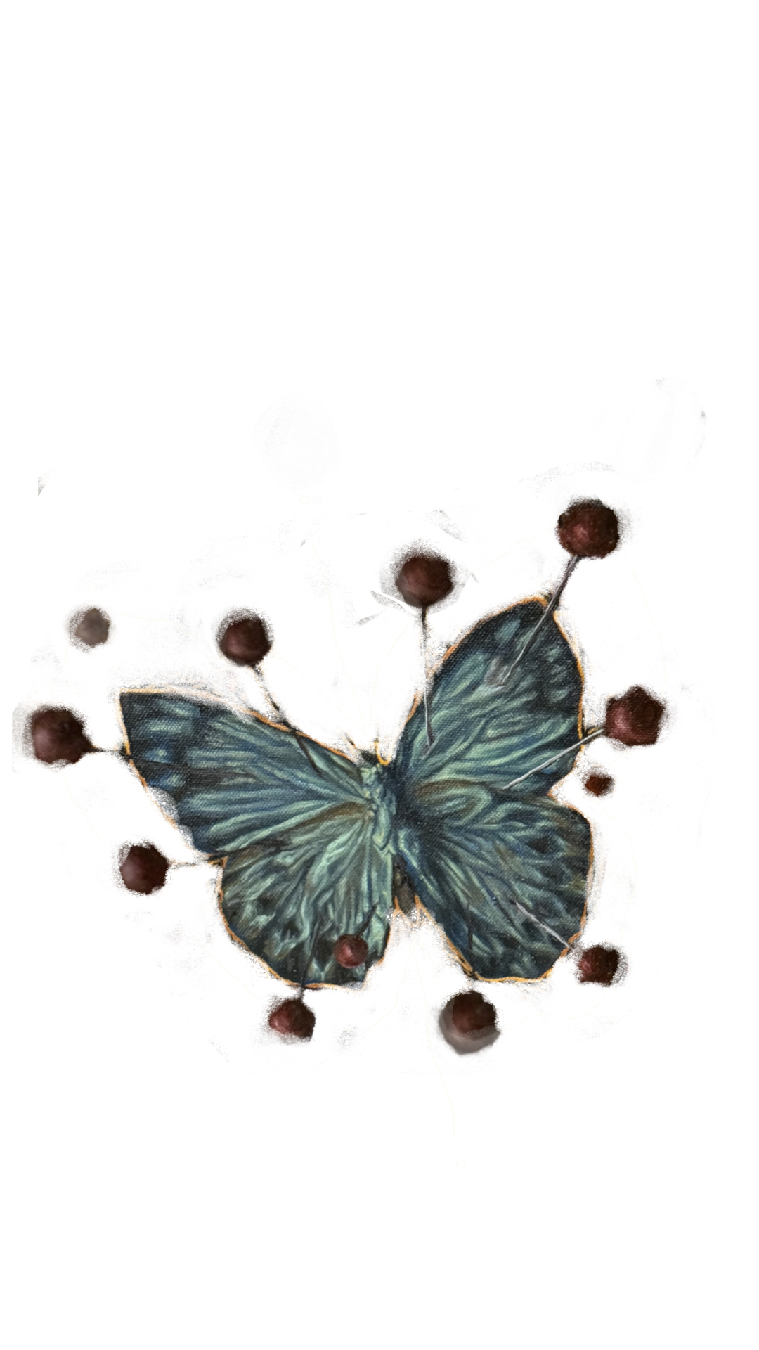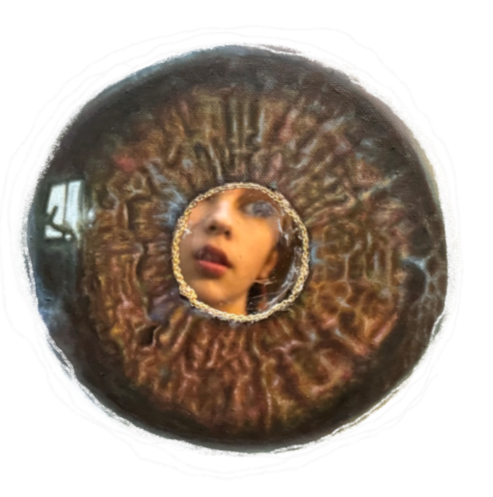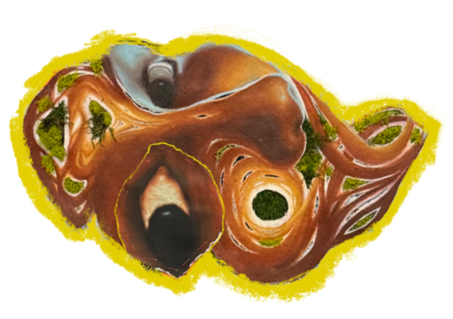 acrylic paint, fake moss, pen, pencil, scrap fabric, wire, canvas paper, digital illustration, paper, mirror, charms, duck tape and thread
