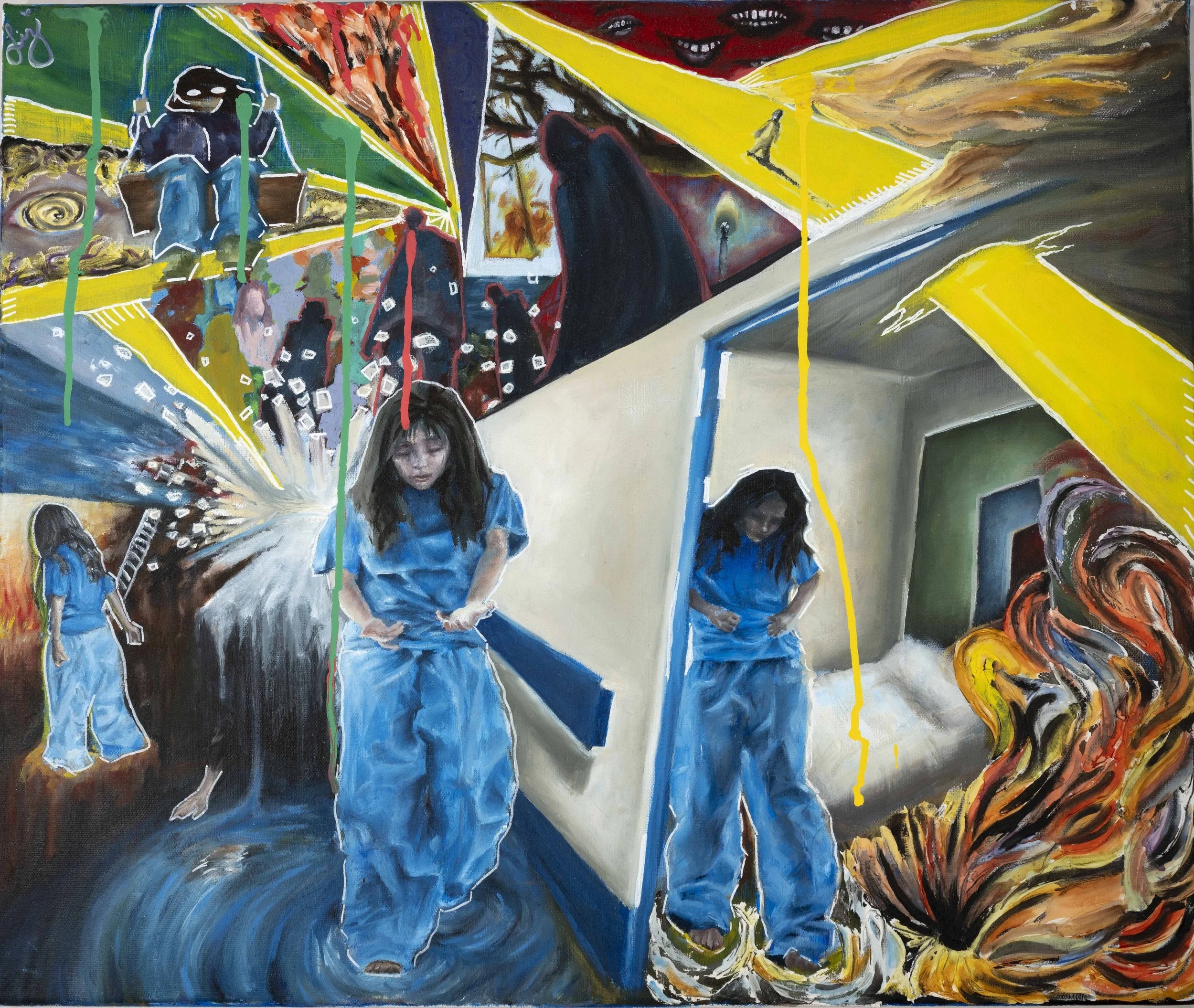 acrylic and oil paint, canvas, mirror and gold chain