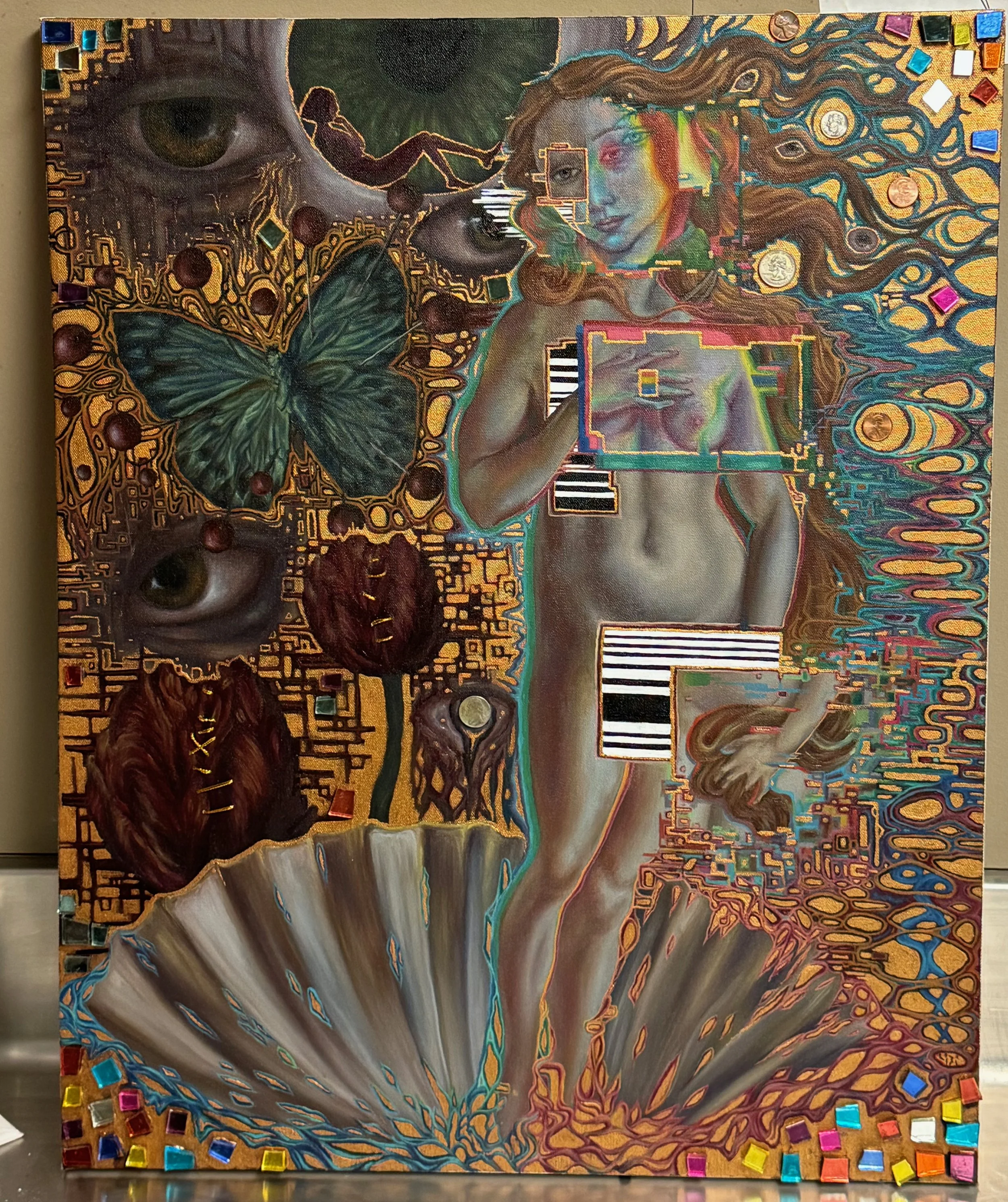 acrylic and oil paint, metallic gold paint, plastic tiles, coins and gold thread